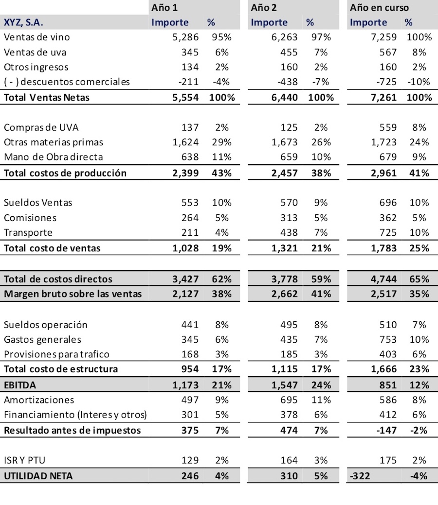Así, para definir una cuenta de resultados de gestión útil para la dirección y la mejora del negocio, puede usarse el siguiente ejemplo, obtenido de una bodega que produce y vende vinos (Bodegas XYZ, SA).